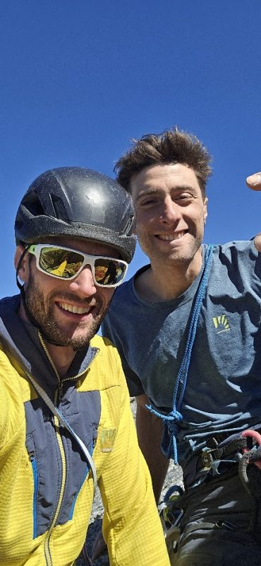 The line naturally guided me upward, and the same happened with the next two easier pitches, until we finally reached the last dihedral. We were getting close to the top. Mirco started leading his way up, making some interesting moves to follow the weaknesses of the wall. He placed three pitons.