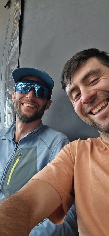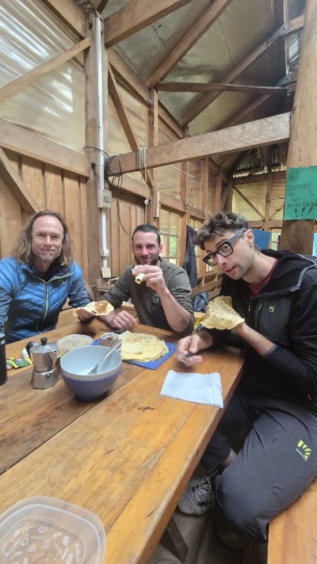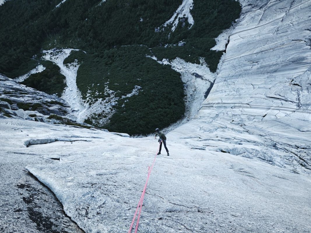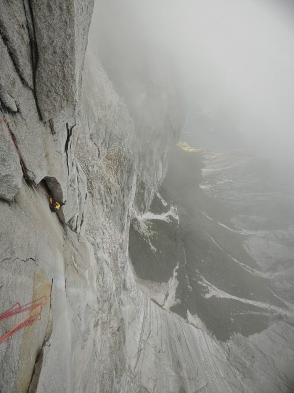 The rest of the route flowed well until we reached the “hardest” pitch. The 5.12c layback was led by Mirco without major problems, until he reached the end of the overhang, where he slipped due to a few raindrops. The same happened to me. The rain stopped and we pushed one more pitch. After that, the rain forced us to go down. With a few wet rappels, we reached the base and walked back to camp in the rain.