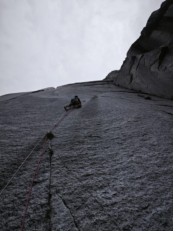 Vladek wanted to take some pictures and I wanted to lead the first pitch, since I hadn’t done it on the first day. Because it’s so slabby, it remained dry, so I was able to do it. The rest of the route was completely wet. Small waterfalls were marking our line and our hearts were disappointed.