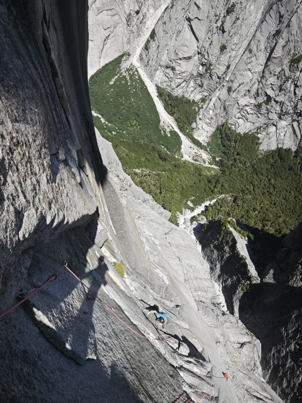 The next day we were back at the base of the wall. The fifth pitch seemed dry enough to try to free it. The rest was still drowning in small rivers. Via the French route, we somehow managed to reach the anchor of “Interstellar” — that’s what we called the pitch because of its look.